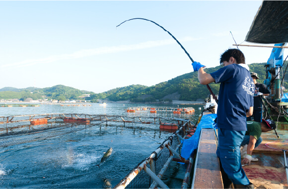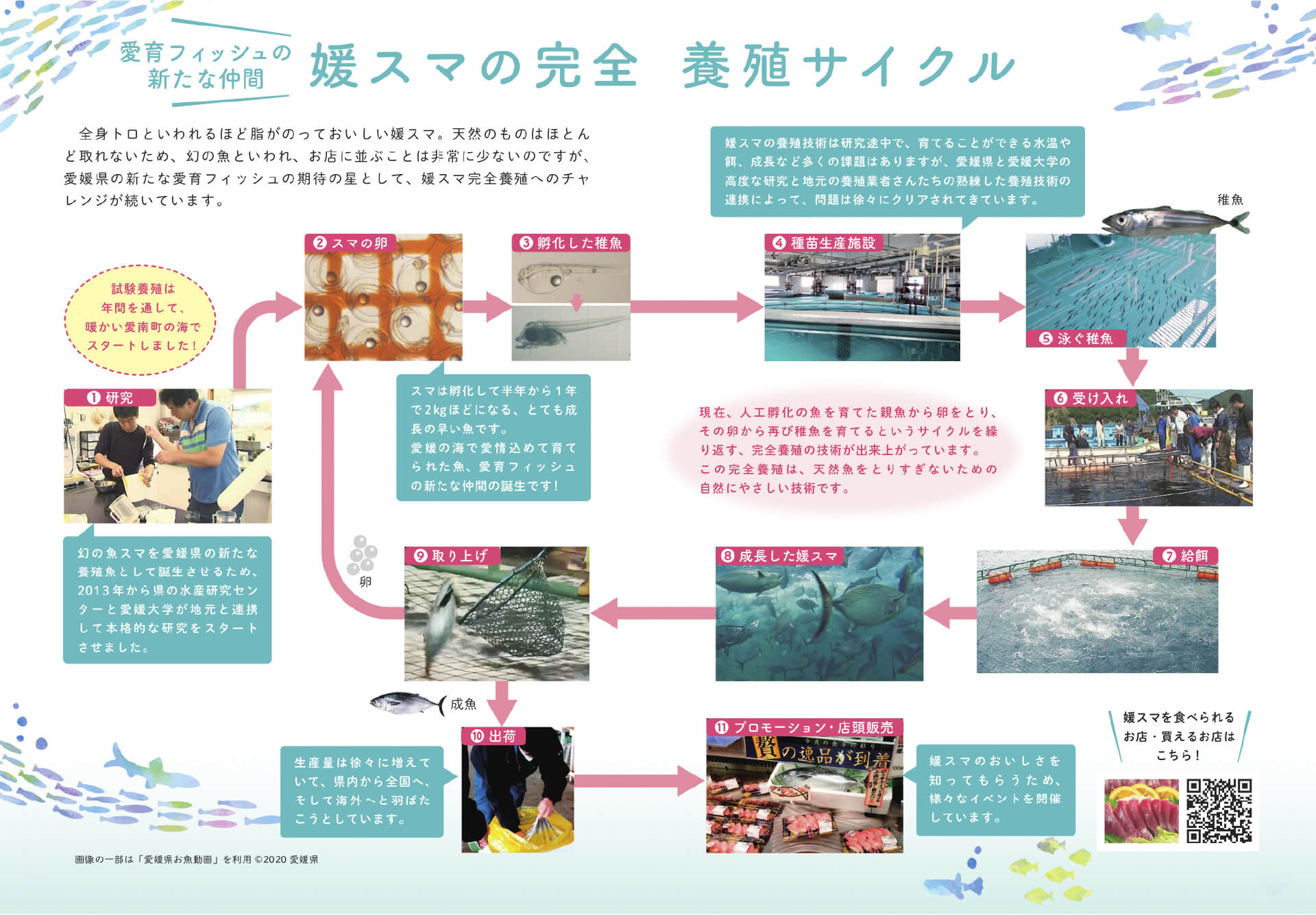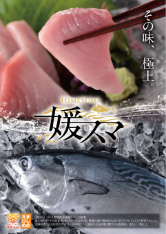 「媛スマ」は、「伊予の媛貴海」をトップブランドとする愛媛県産の養殖スマを包括した総称です。愛媛生まれの愛媛育ちで他産地と差別化され、シンプルで覚えやすく、愛くるしい響きの「媛スマ」に決定しました。天然のものは漁獲が少ないため、お店に並ぶことがほとんどなく「幻の高級魚」と言われる希少な魚です。養殖ではふ化して半年から1年で2kgほどになる、とても成長の早い魚です。養殖スマは通年きめ細かな脂がのり、全身トロ(背は中トロ、腹は大トロ)と言われる身質です。食味は、臭みがなくさっぱりとしており、滑らかな口当たりが特徴です。刺身や炙り、漬け等の料理のほか、和洋中様々な料理に利用できますが、特に酢飯に合い、握りや巻き寿司に適しています。愛媛県では新たな愛育フィッシュの期待の星として、2013年からスマ完全養殖へのチャレンジを続けています。媛スマは、愛媛県と愛媛大学の研究、地元生産者さんの養殖技術の連携により「完全養殖」に成功し、生産量が徐々に増えて皆さんの食卓に届けられるようになりました。