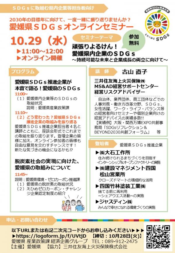 県では、SDGsに取り組む県内中小企業等を対象にSDGsセミナーを開催しました。今回は、SDGsの推進に知見が豊富な三井住友海上火災保険株式会社の講師と愛媛県SDGs推進企業とともにこれまでの取組状況を振り返り、企業等の取組事例や県制度の紹介をふまえながら、SDGsを経営に組み込むヒントとなるセミナーを開催しました。