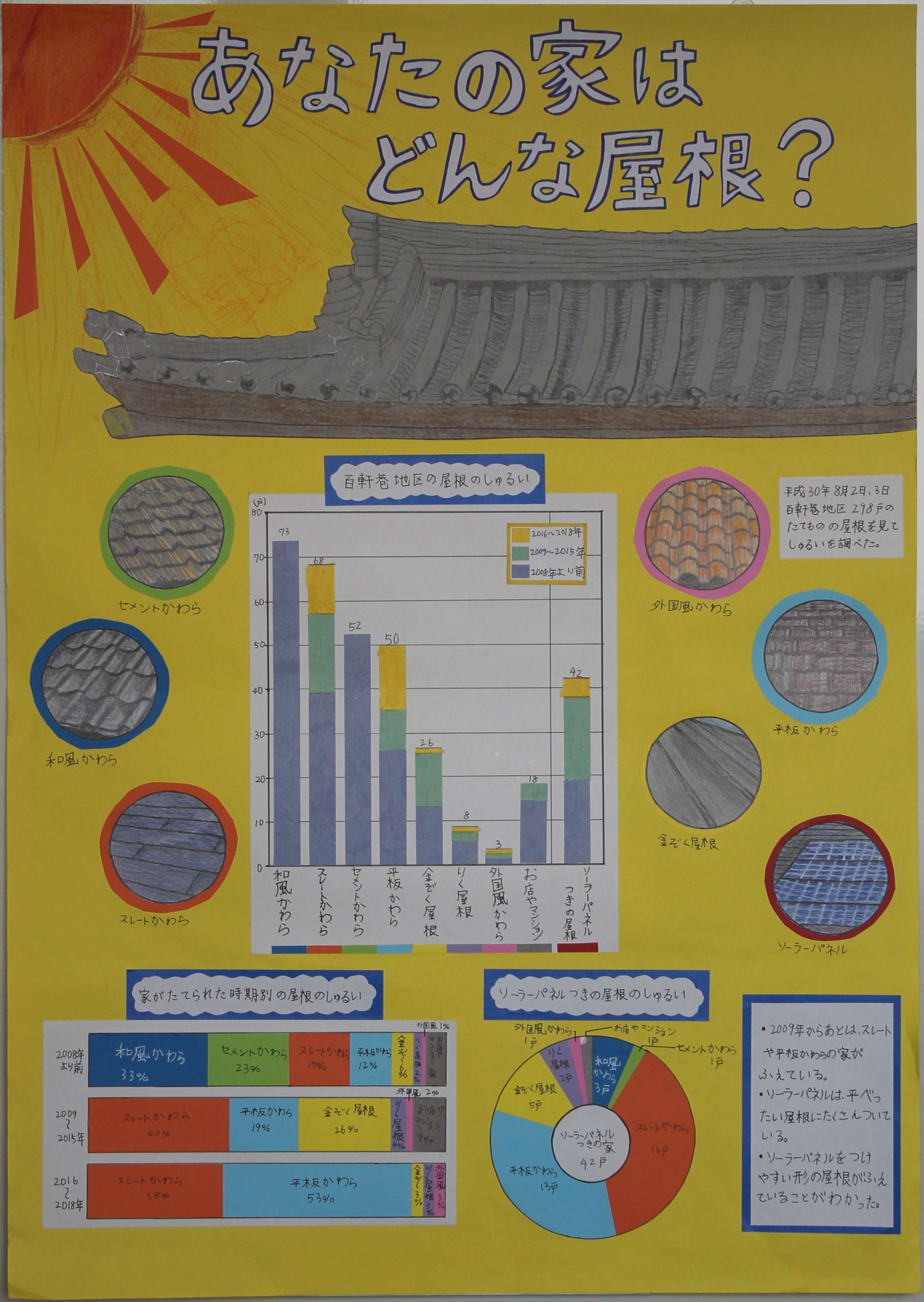 かわらの種(しゅ)類(るい)だけでなく、ソーラーパネルが設(せっ)置(ち)されている屋根(やね)についても円グラフにまとめられており、普(ふ)段(だん)何気なく目にしている屋根