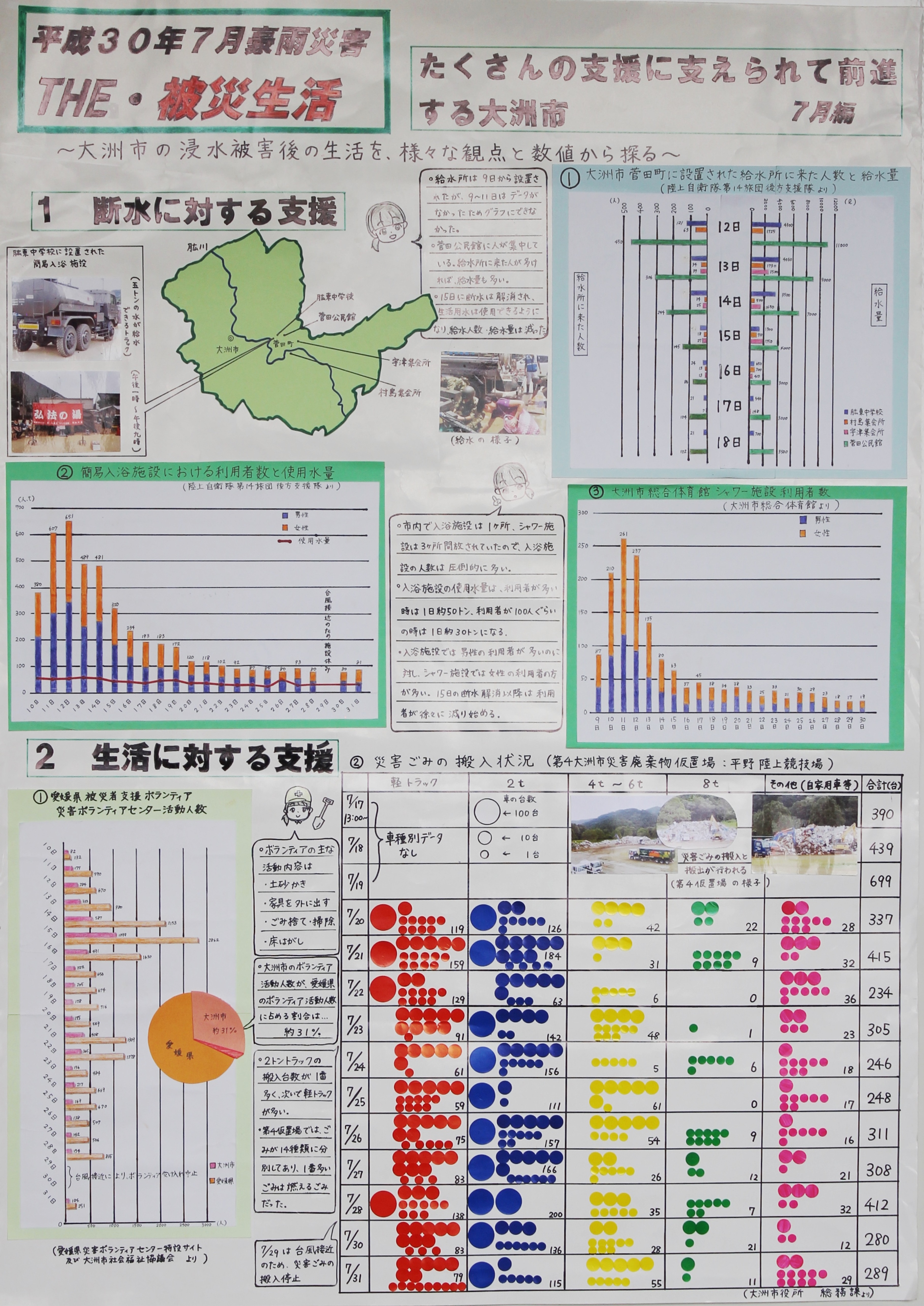 平成30年7月豪雨により大きな被害を受けた大洲市において被災された方々の断水時の給水に関するデータやボランティアへの参加人数などが、丁寧なグラフや表で示されており、被災した時の様子を伝える貴重な資料となっています。